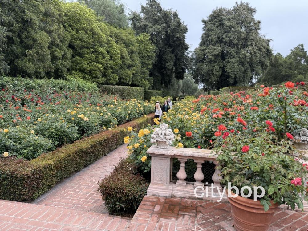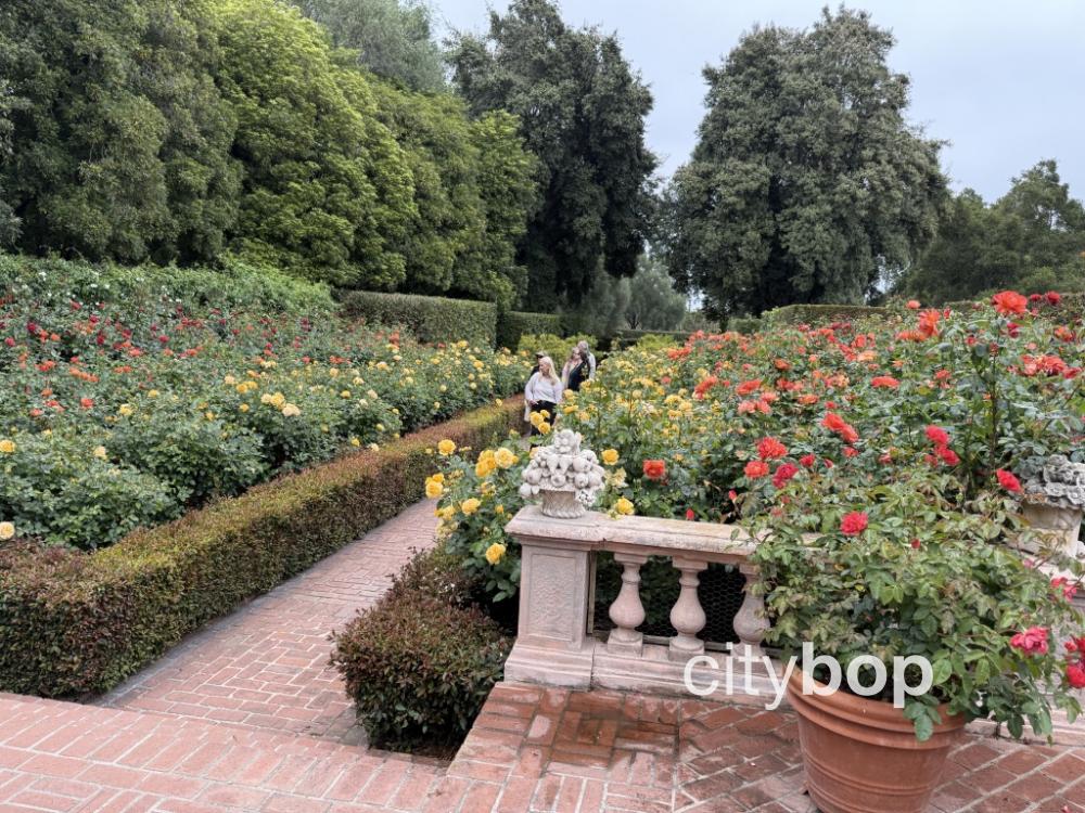 I felt transported to a grand European estate while strolling the pathways along the Italian-style Parterre Garden at Lotusland.  The dazzling display of roses was framed by tidy hedges, and there were two enchanting water features.