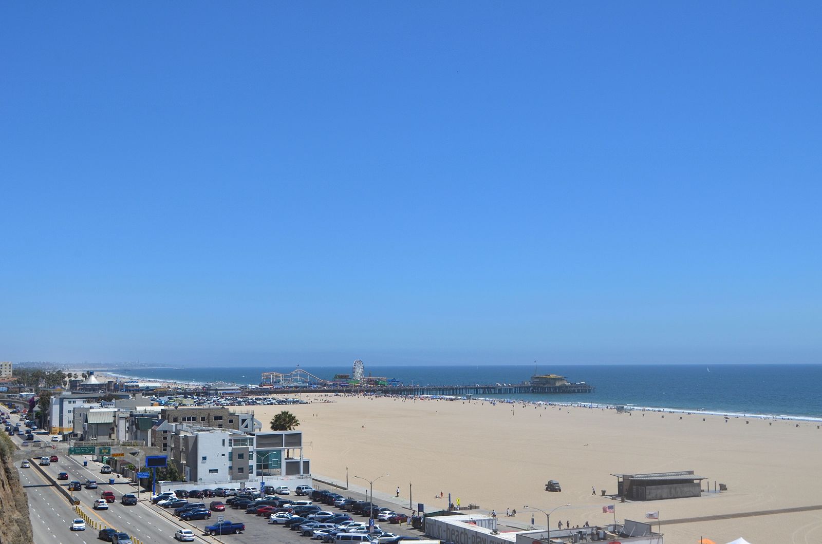 The Pacific Coast Highway divides Santa Monica's downtown area from the beach, but there's a pedestrian overpass along Colorado Avenue that connects the two. Cars can drive down the California Incline to get from downtown Santa Monica to the beach.