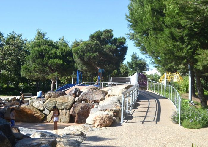 The lovely splash pad is in a rockery, adjacent to the playground. What a great place for kids to cool off! Best of all, there's lots of shaded areas for parents to sit while watching their kids play.