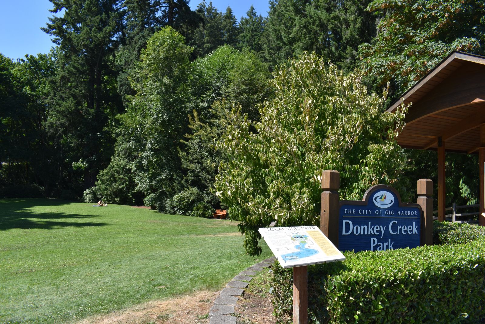 The tranquil Donkey Creek Park (1714 N. Harborview Drive) at Gig Harbor, has a lush, lawned area with a creek and viewing platform. It's just across the road from the Gig Harbor Museum and Austin Estuary, and is a lovely place for a picnic, to read or book, or for kids to run around.