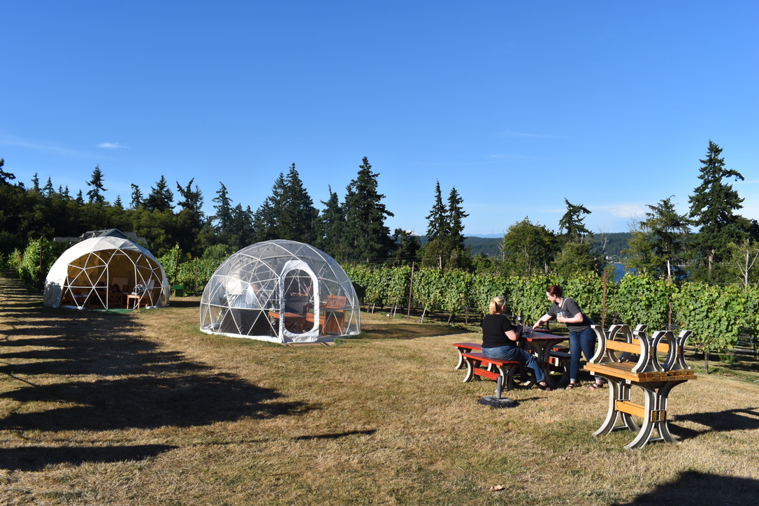The award winning Holmes Harbor Cellars has an idyllic setting on a hillside, with an Italianate style building, that houses a small tasting room. The property has a large lawn area overlooking Holmes Harbor, with plenty of outdoor seating and cozy igloos for cooler days.