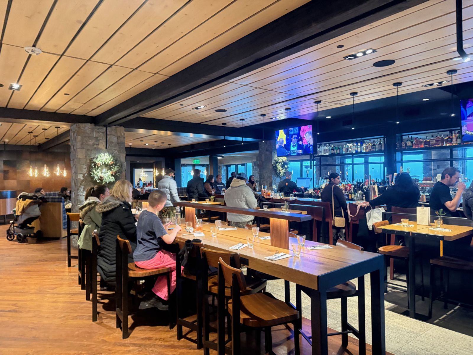 The Source Plates and Pours is the formal restaurant at Suncadia Lodge, with booths and tables overlooking the mountains.